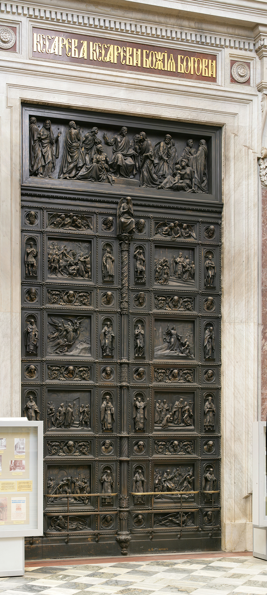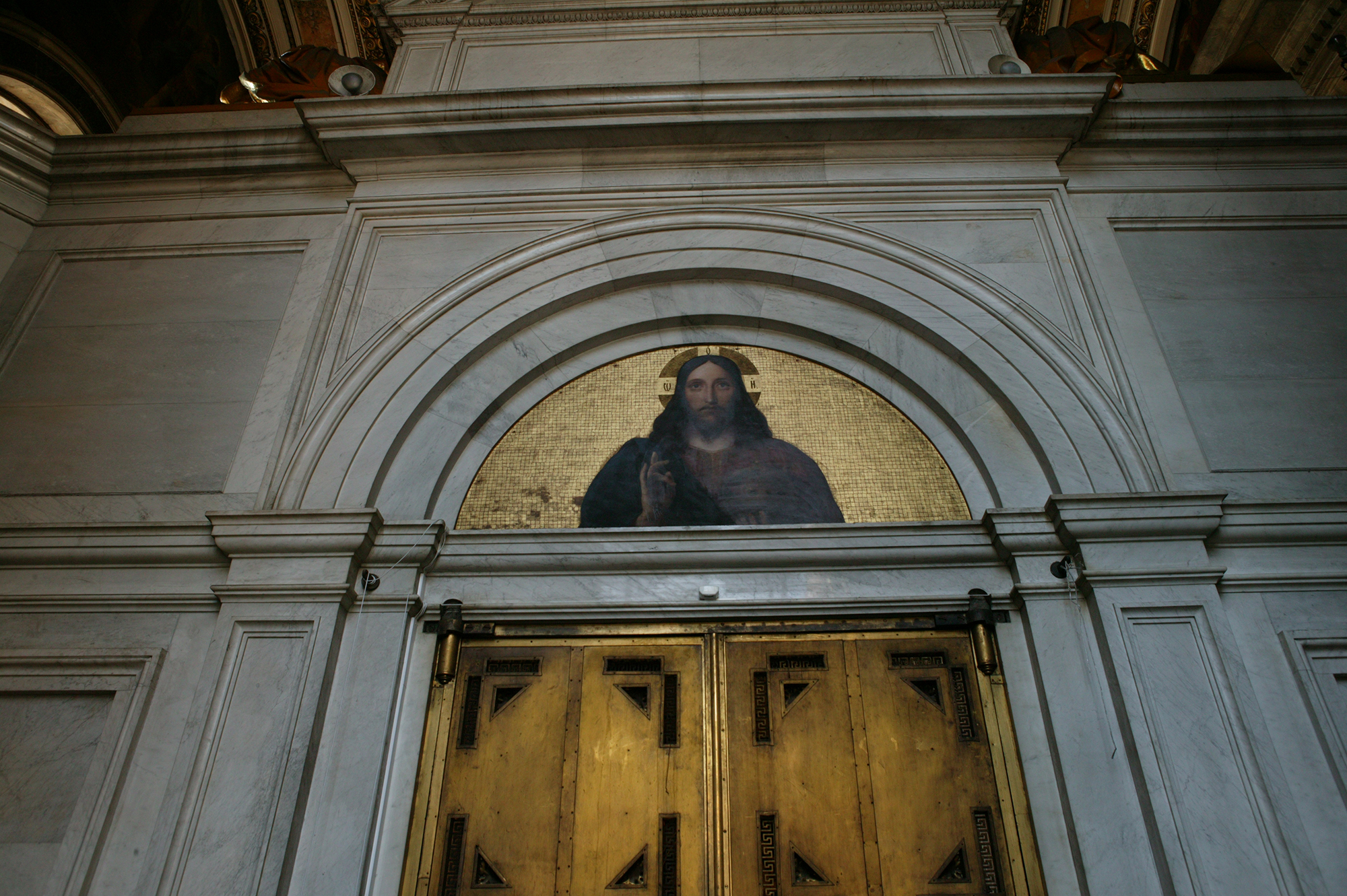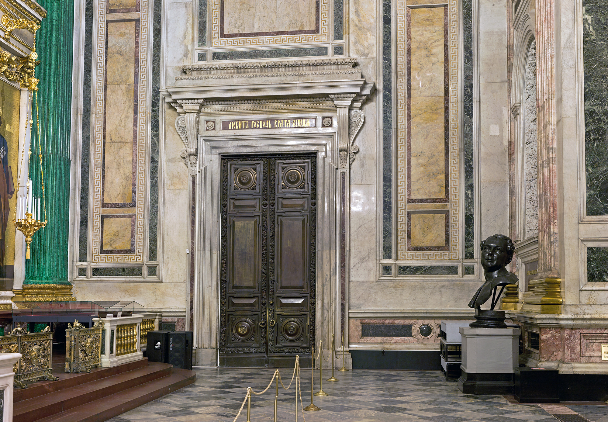Этим камнем обрамлены три большие и четыре малые двери, он использован для элементов декора в арках боковых нефов. Благородные тона мраморной облицовки эффектно сочетаются с темной бронзой массивных дверей, с позолотой скульптур и яркими красками росписей.