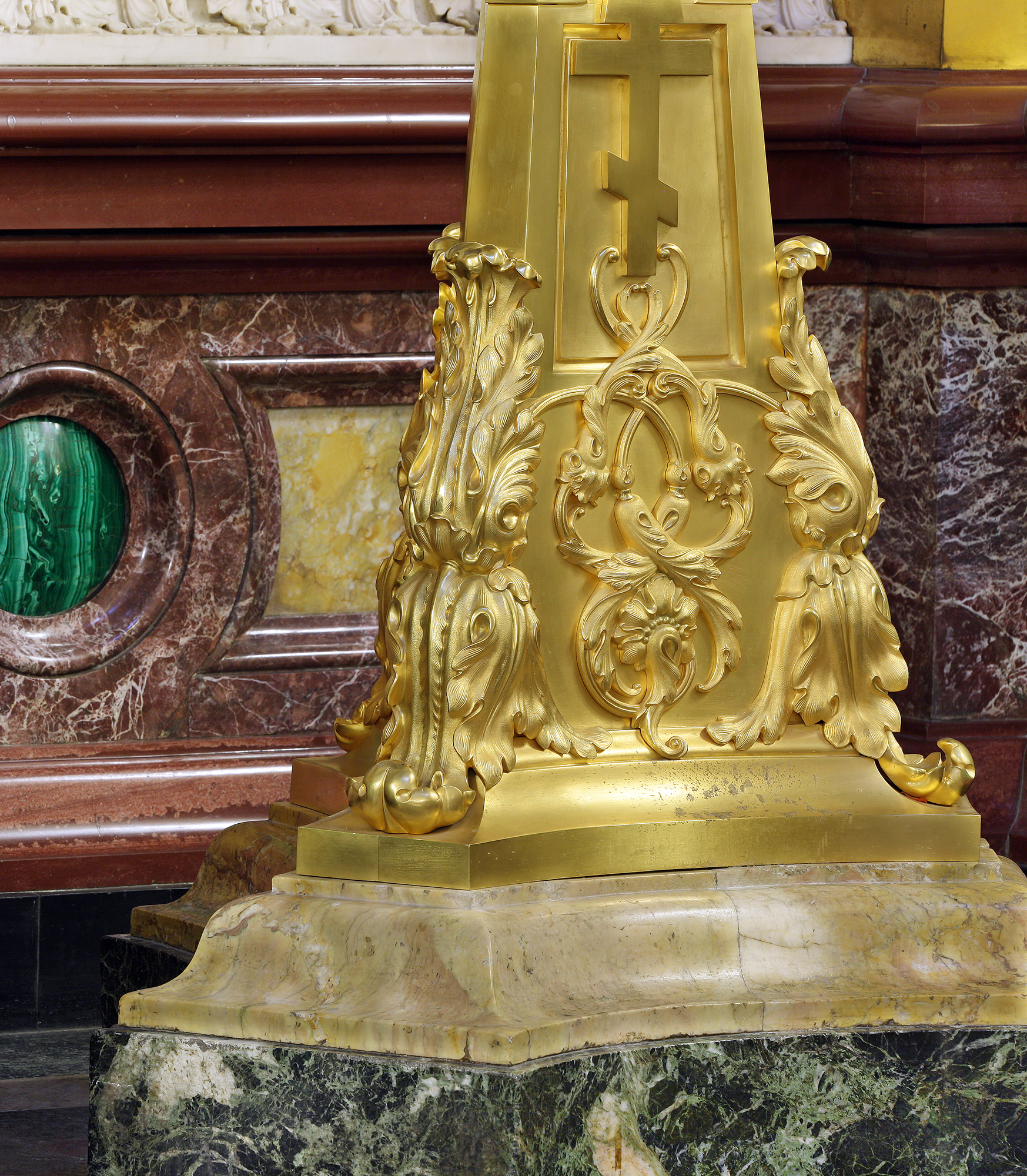 Такой же желтый мрамор использован для мелких декоративных деталей и орнамента на стенах центральной и алтарной части, для вставок на полу солеи, вставок в цоколе главного иконостаса и малом фризе над иконами первого яруса, а также в пьедесталах торшеров.