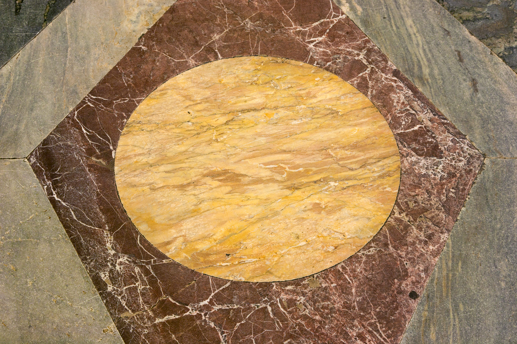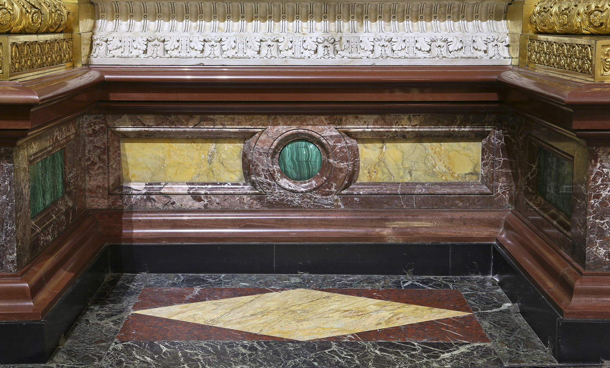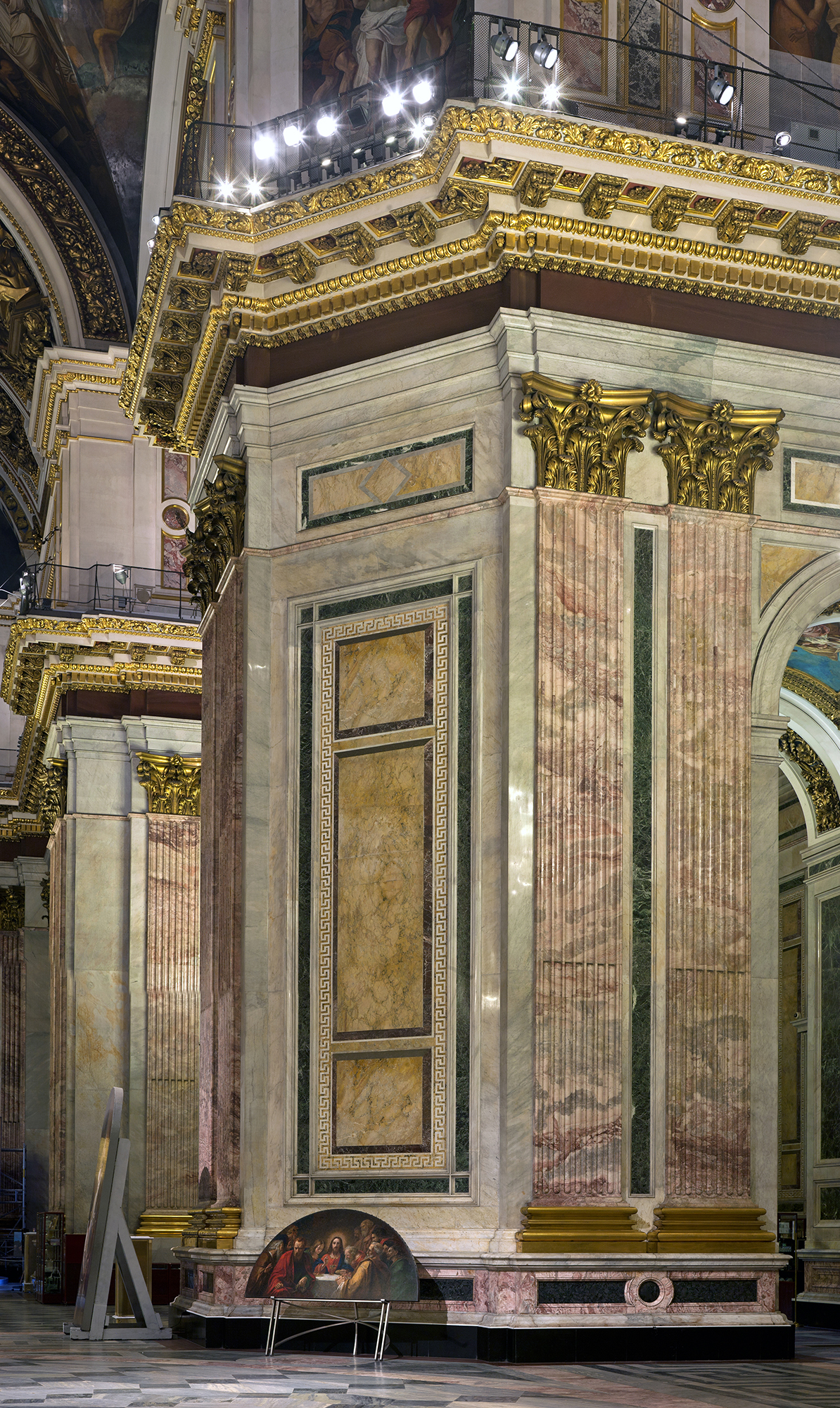 Желтый сиенский мрамор в виде крупных прямоугольных профилированных плит в обрамлении зеленого генуэзского мрамора украшает четыре подкупольных пилона, оживляя своим теплым тоном интерьер.
